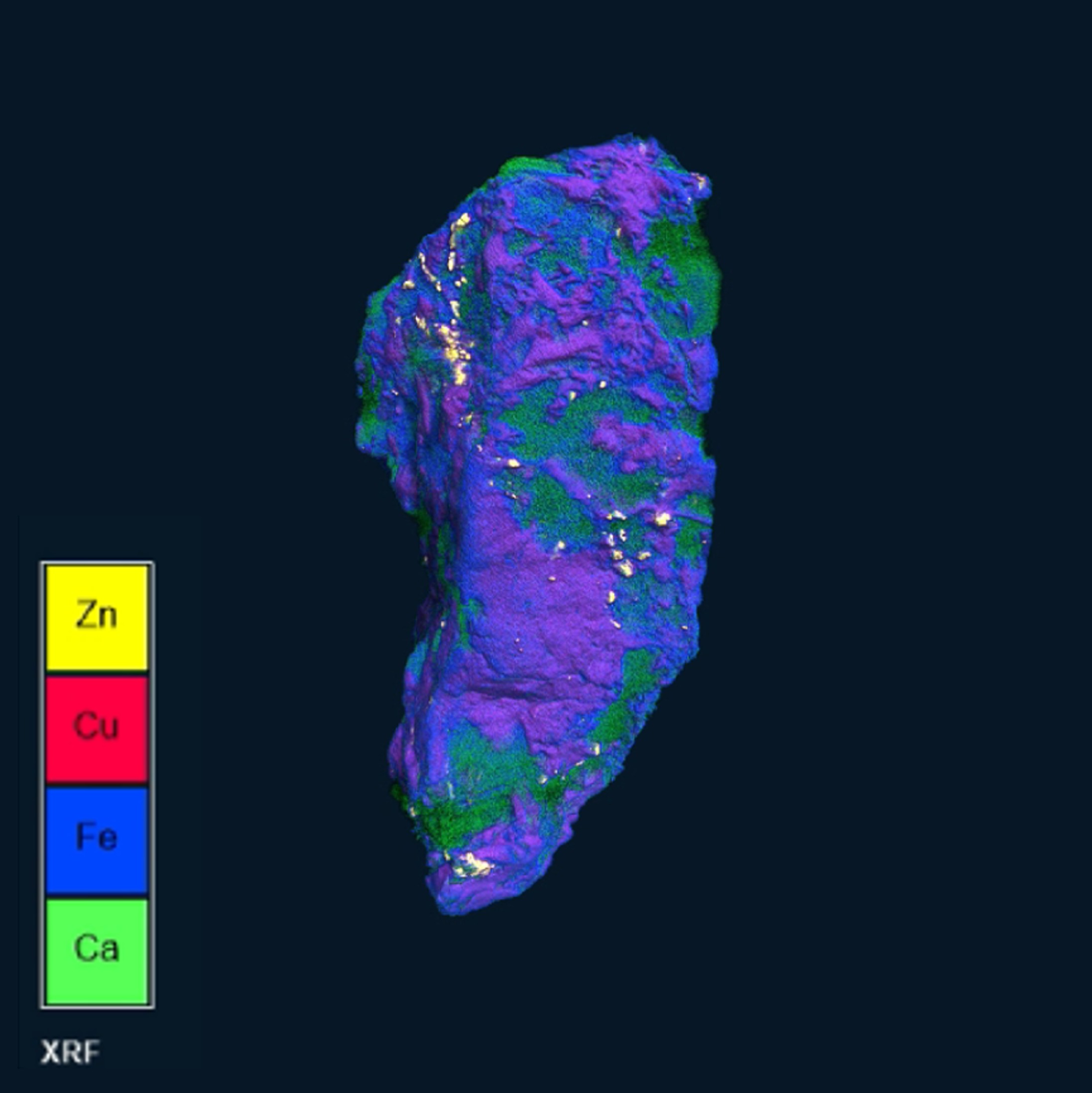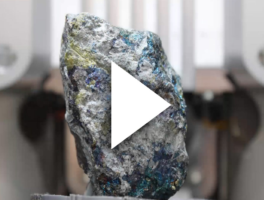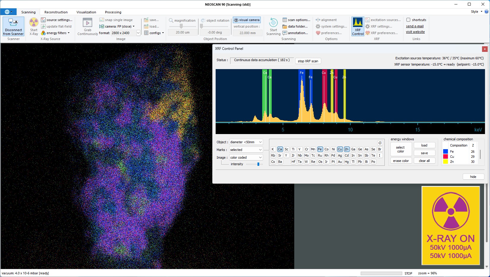Chalkopyrit skenovaný pomocí přístroje Neoscan N90. Integrovaný modul micro-XRF pro celé pole umožňuje elementární mapování. Software N90 zaznamenává energetická spektra a dokáže vytvořit barevně kódované mapy složení objektu.