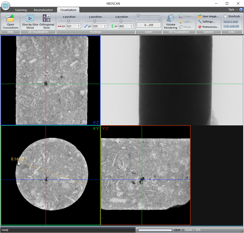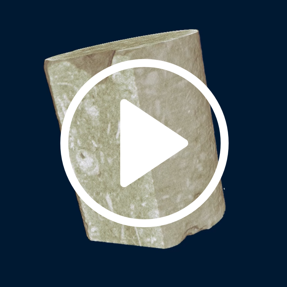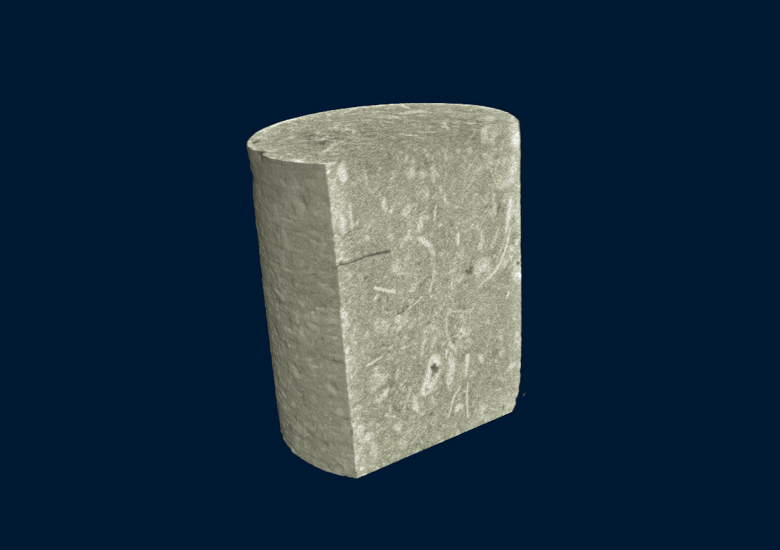 Vzorek karbonátu skenovaný při velikosti pixelu 9,8 µm, zobrazující jeho vnitřní 3D mikrostrukturu nedestruktivně.