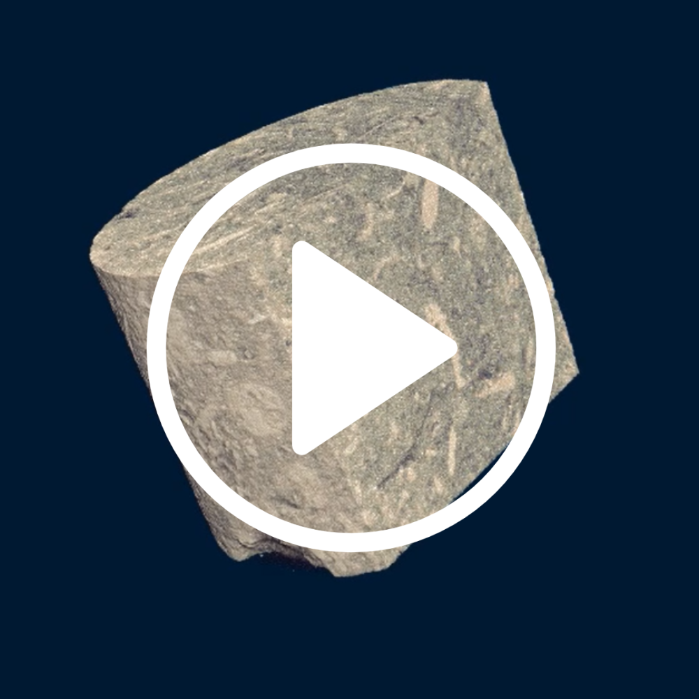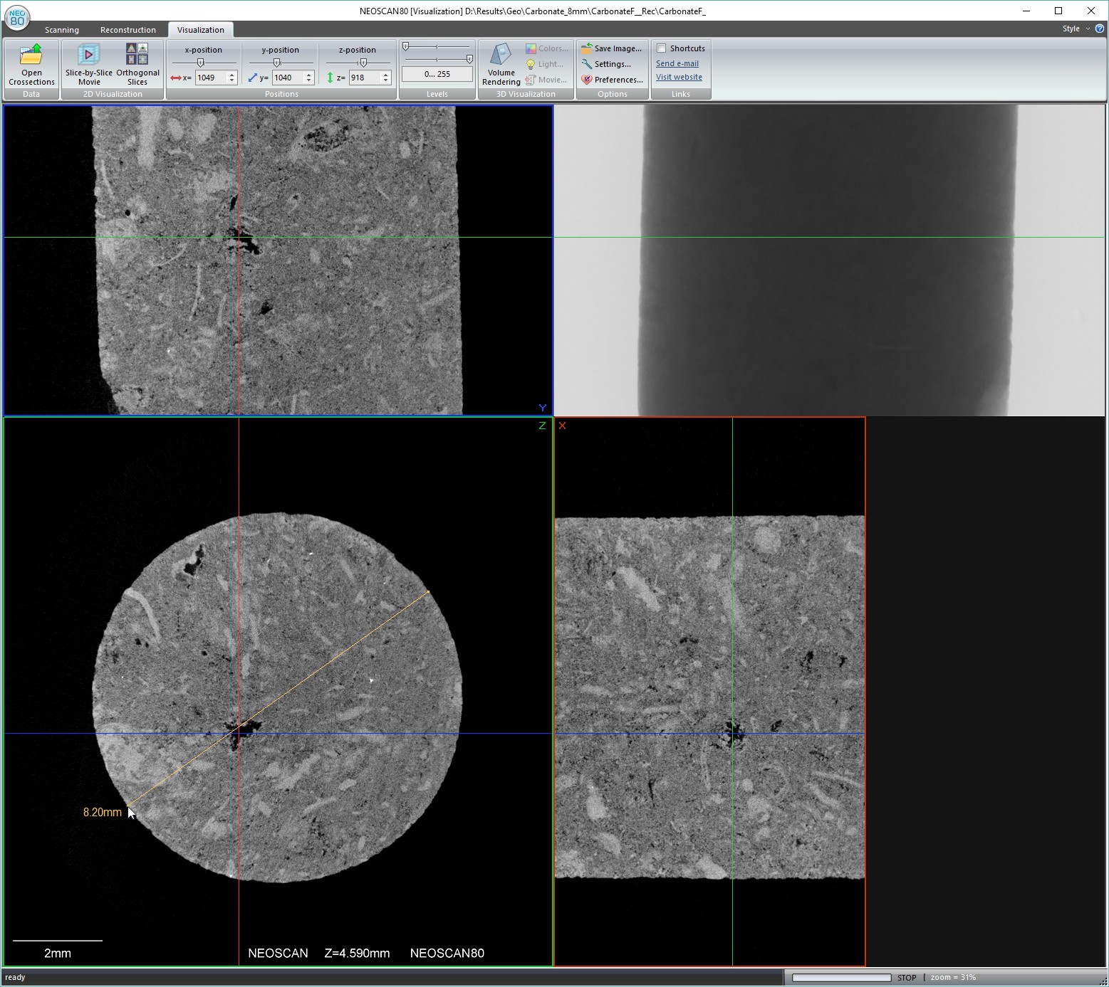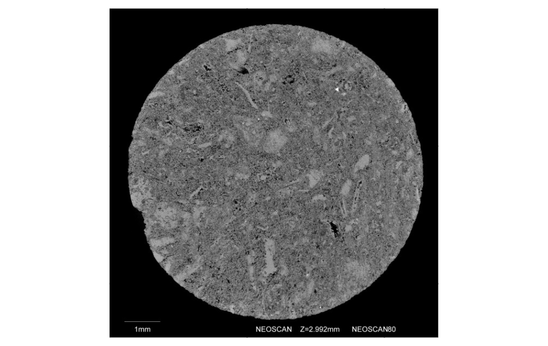 Vzorek karbonátu skenovaný při velikosti pixelu 1,8 µm, zobrazující jeho vnitřní 3D mikrostrukturu nedestruktivně.