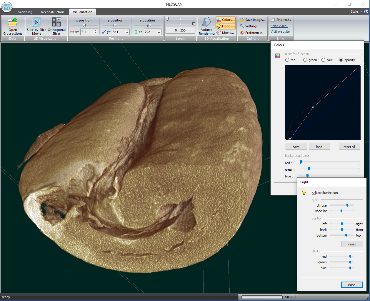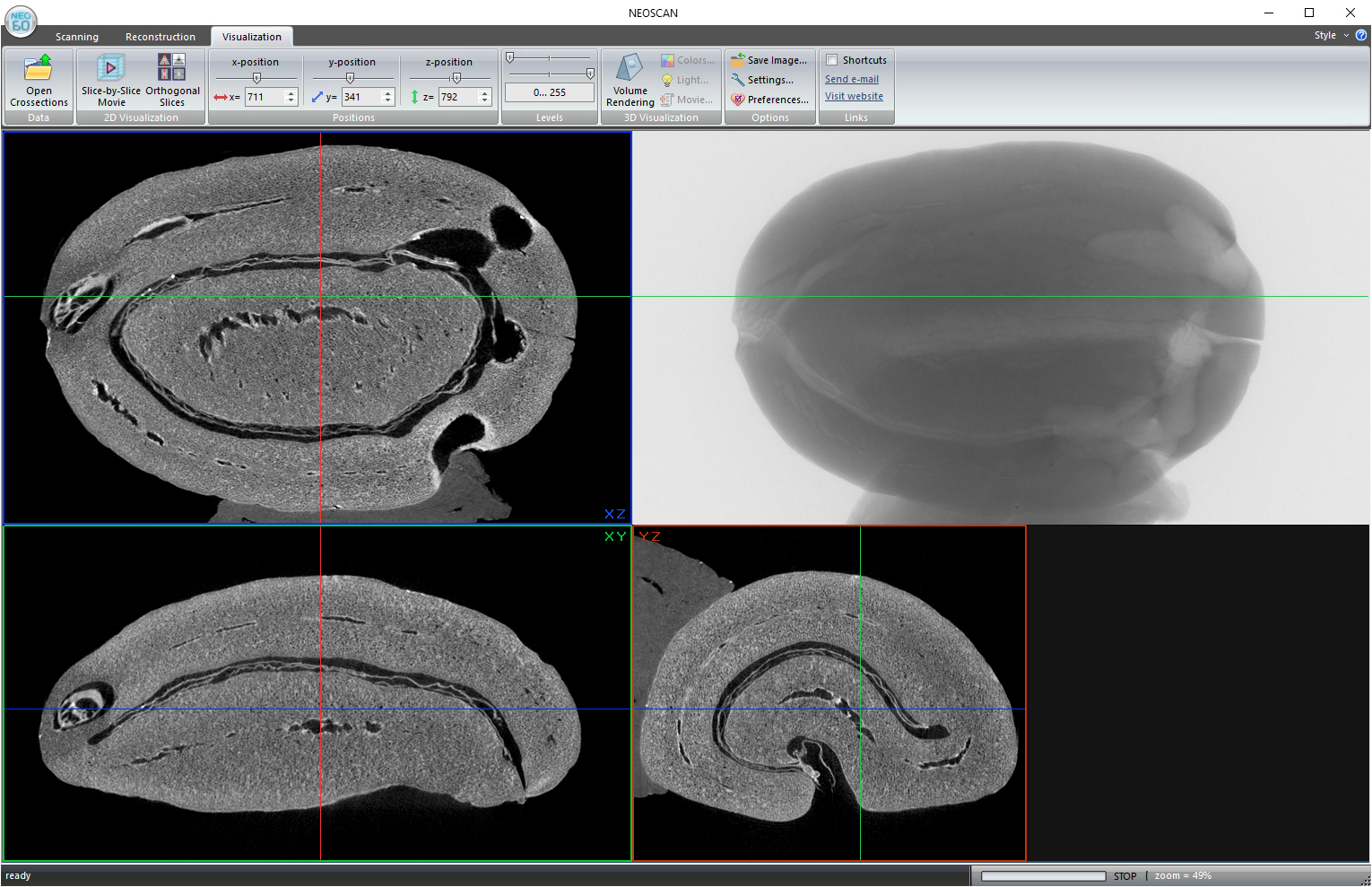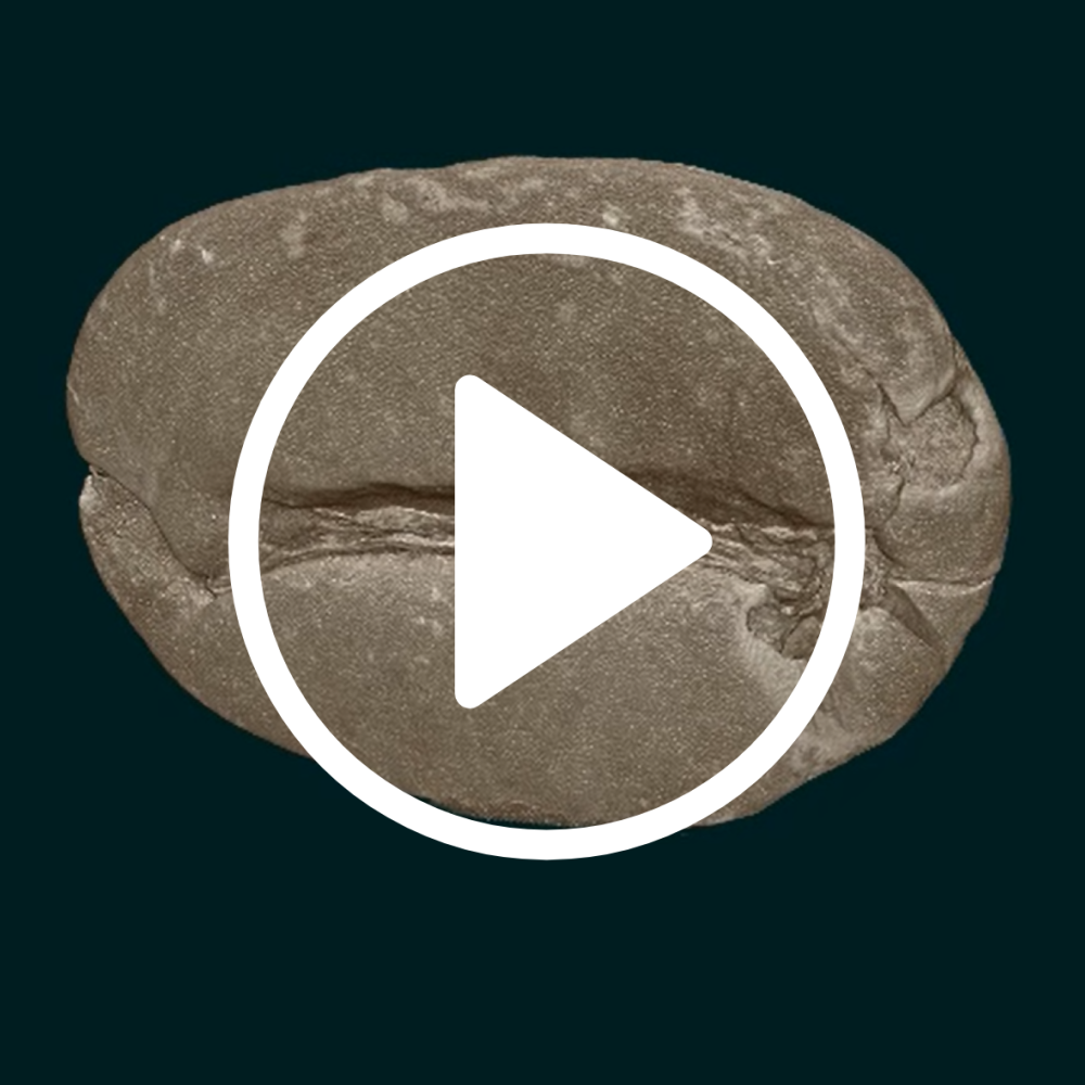 Mikro-CT sken praženého kávového zrna, zobrazující jeho vnitřní pórovitou strukturu v 3D při velikosti pixelu 9,8 µm.