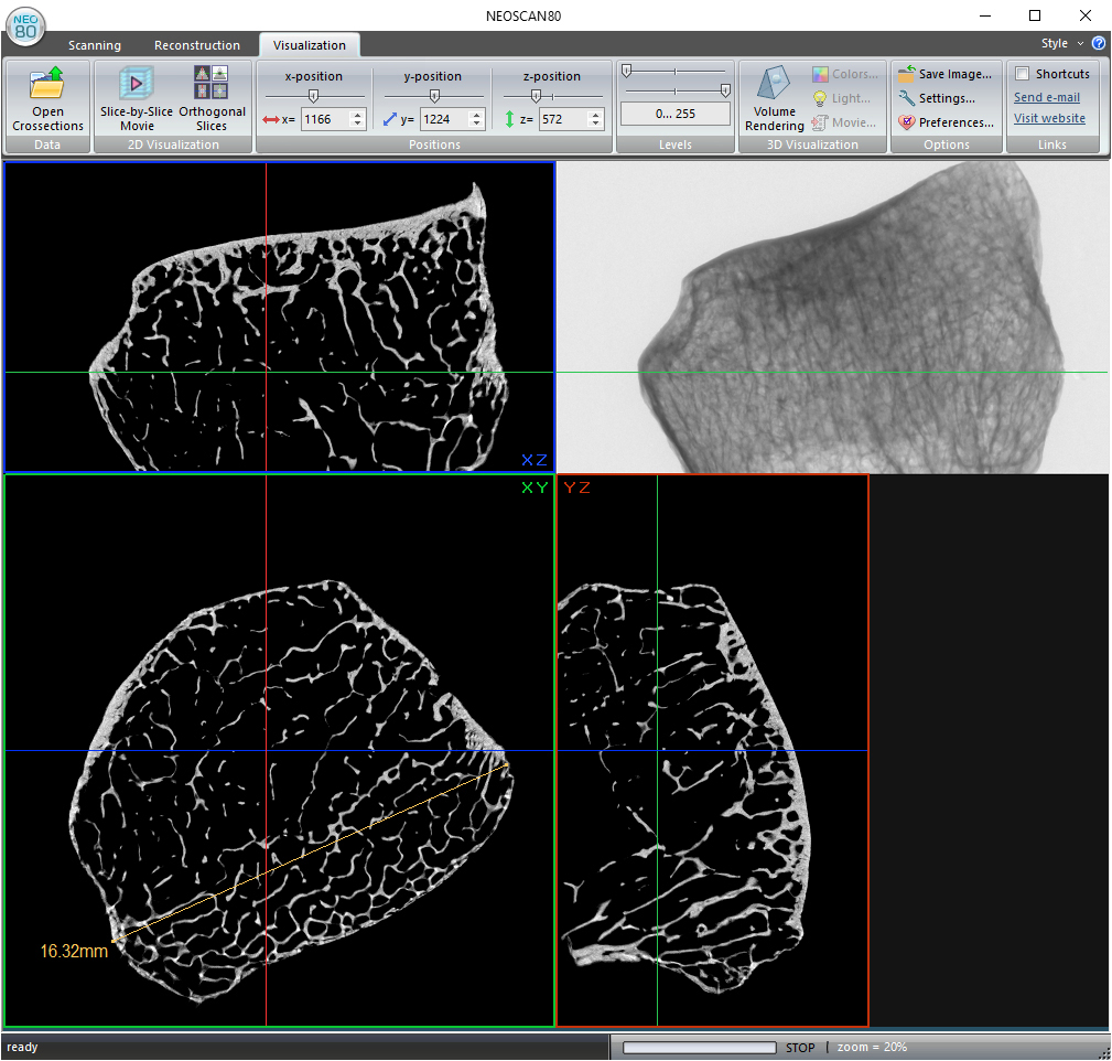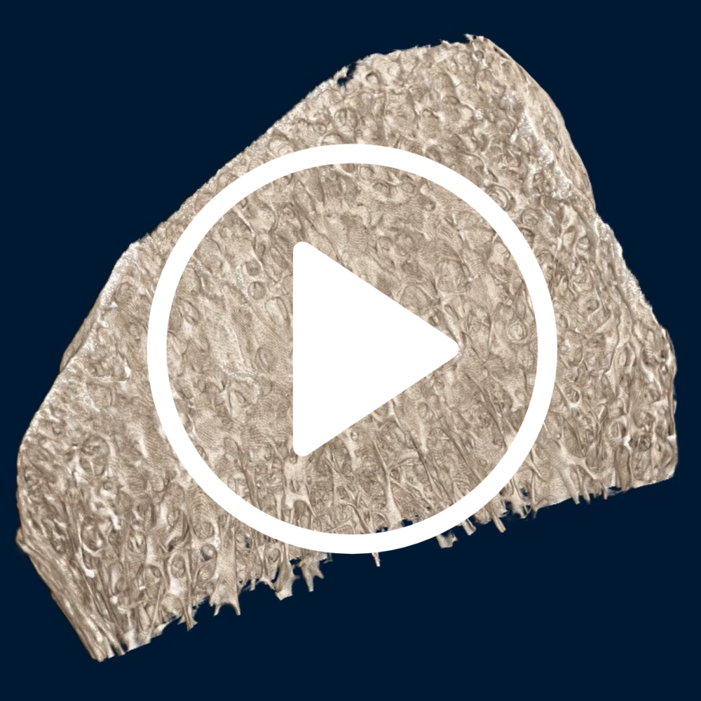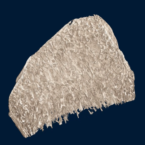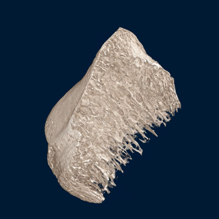 MikroCT sken kosti při velikosti pixelu 8 µm, zobrazující trabekulární strukturu uvnitř kosti v 3D nedestruktivně.