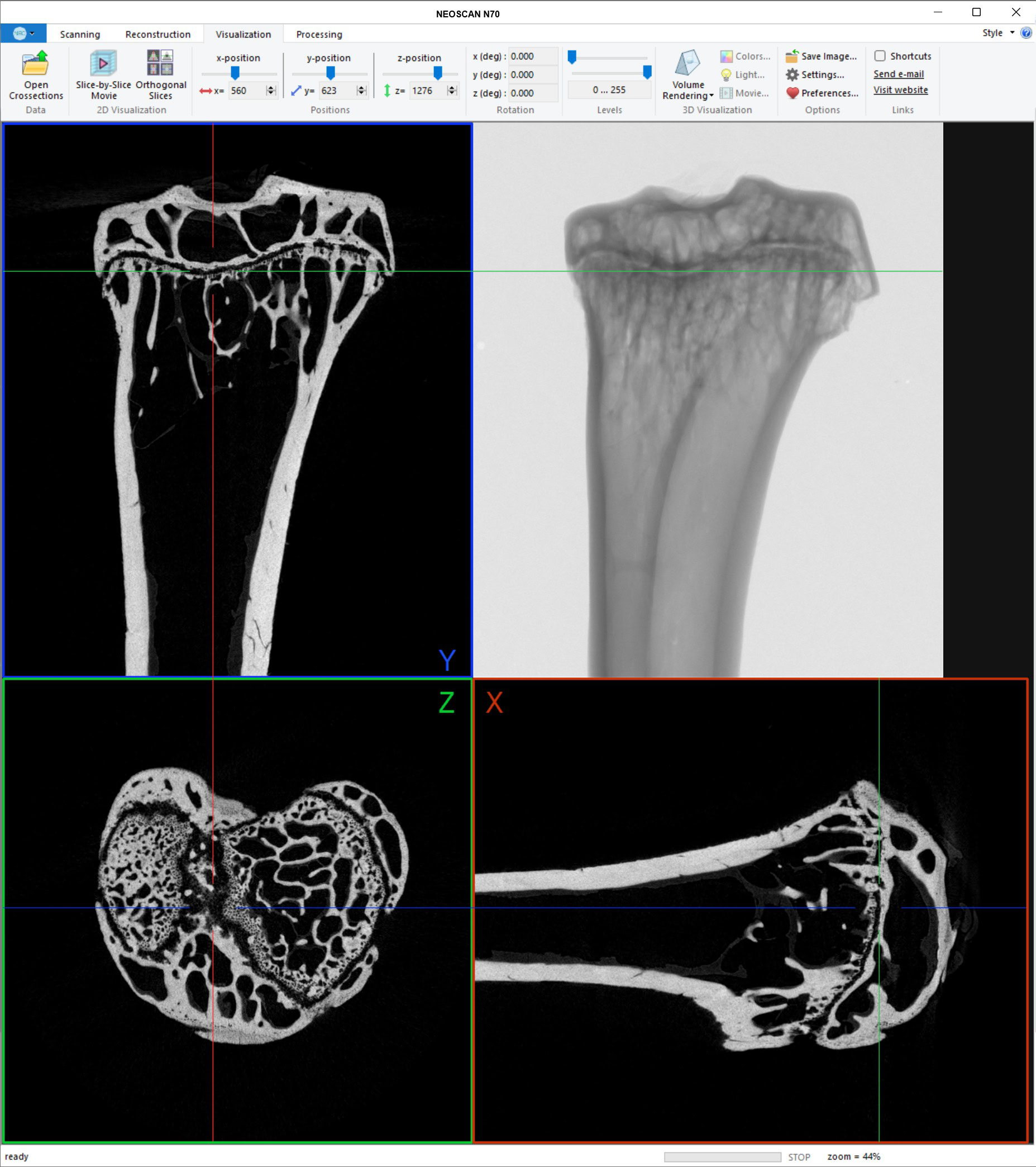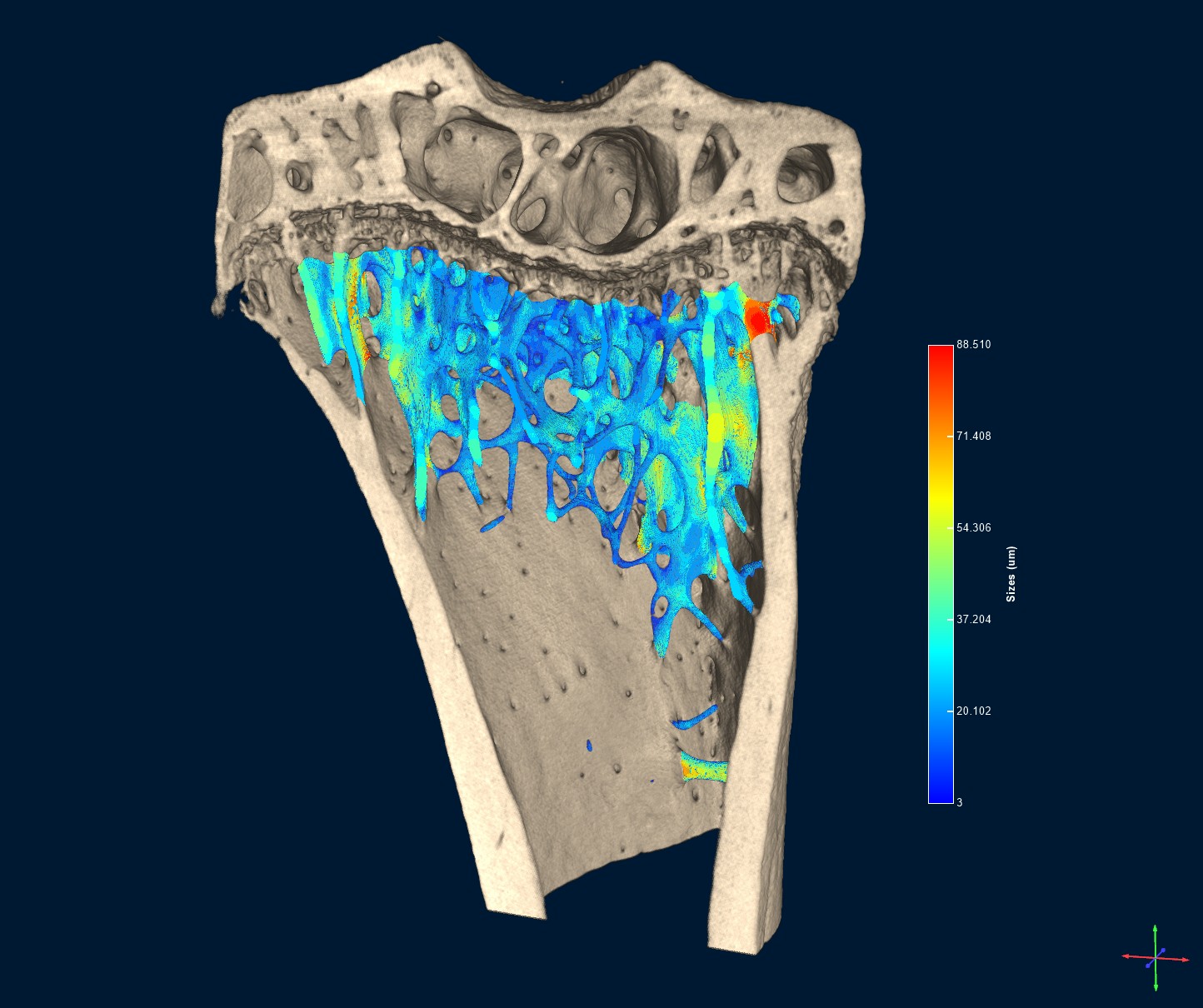 Kost myši skenovaná přístrojem Neoscan N70 ve vysokém rozlišení 3 µm/pixel umožňuje analýzu tloušťky trabekulární kostní struktury.