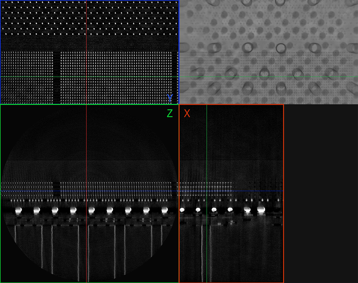Nano-CT sken pokročilého GPU s integrovanou vícevrstvou pamětí s vysokou propustností. Celé GPU o velikosti 40 mm bylo skenováno při velikosti voxelu 500 nm. Sken jasně rozlišuje každé jednotlivé TSV (Through-Silicon Vias), ukazující neporušená propojení pro komunikaci mezi paměťovými moduly.