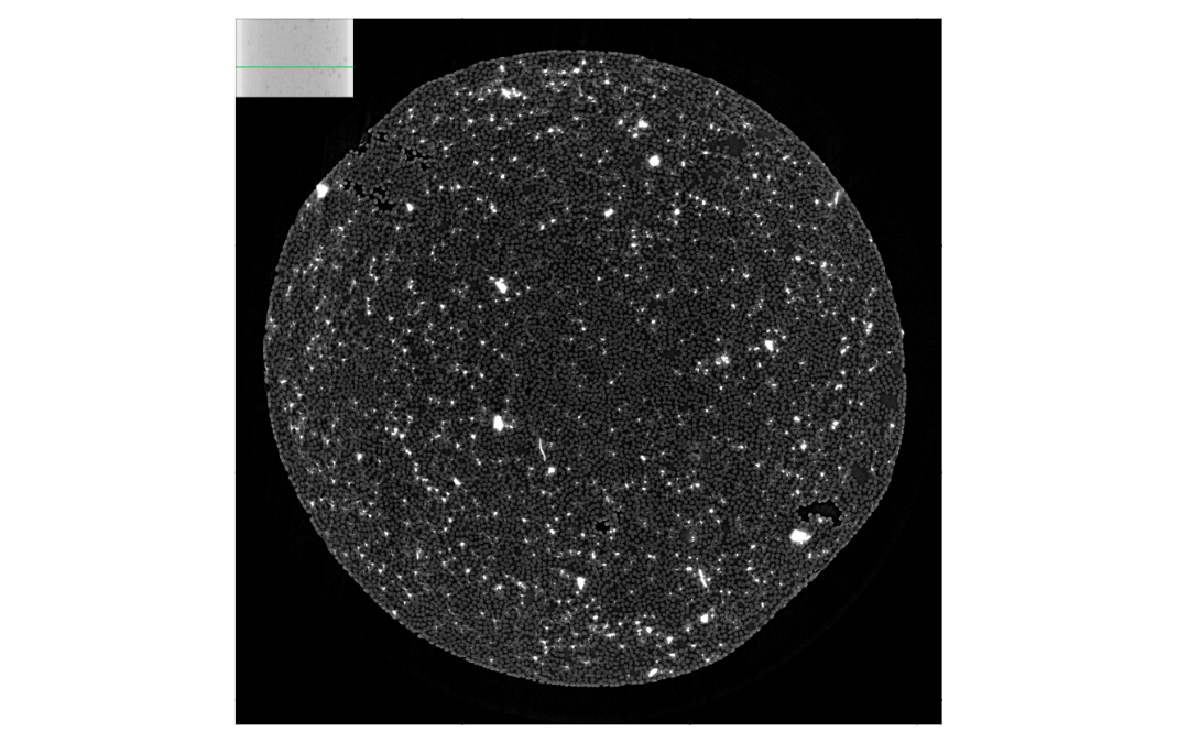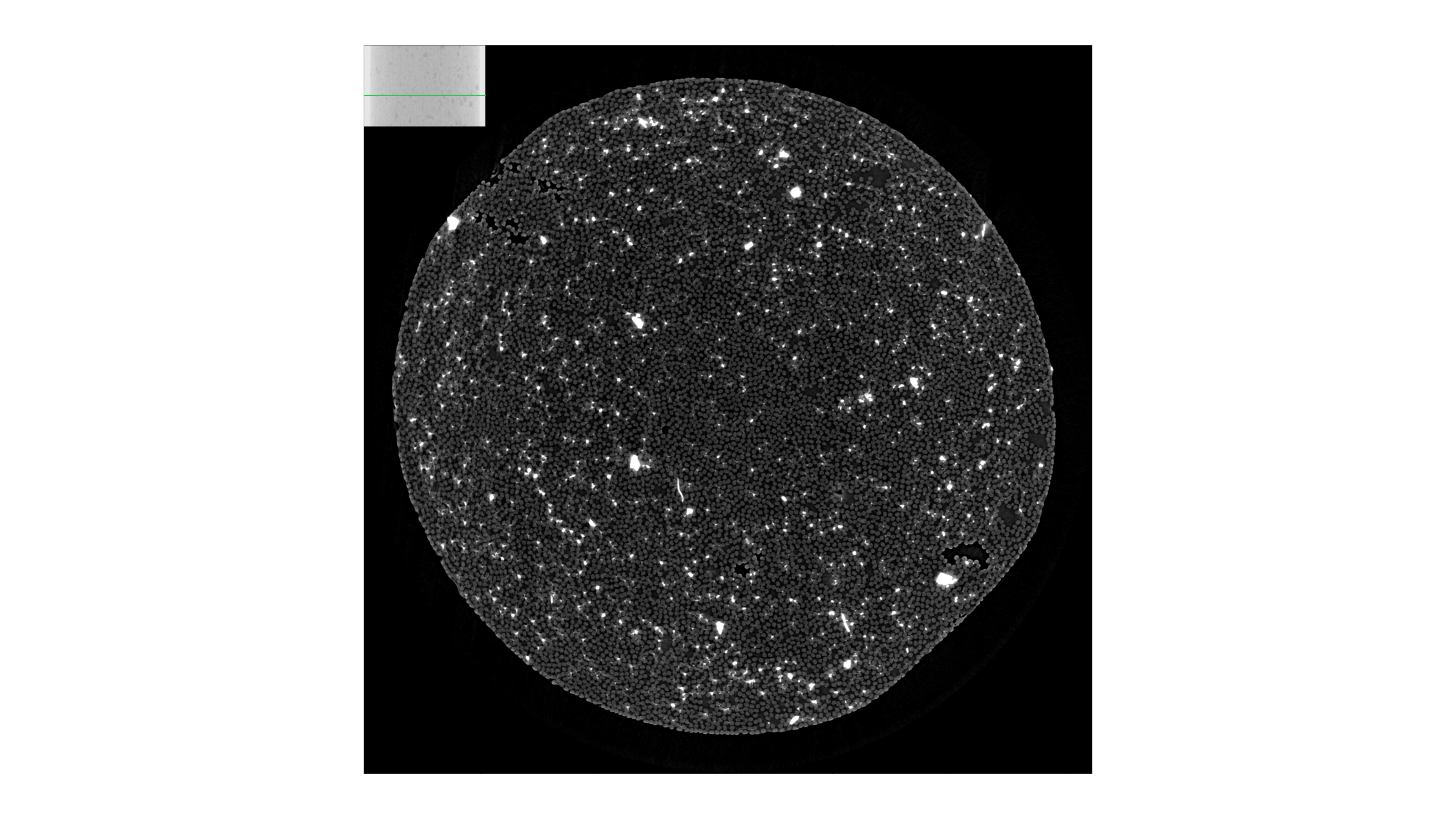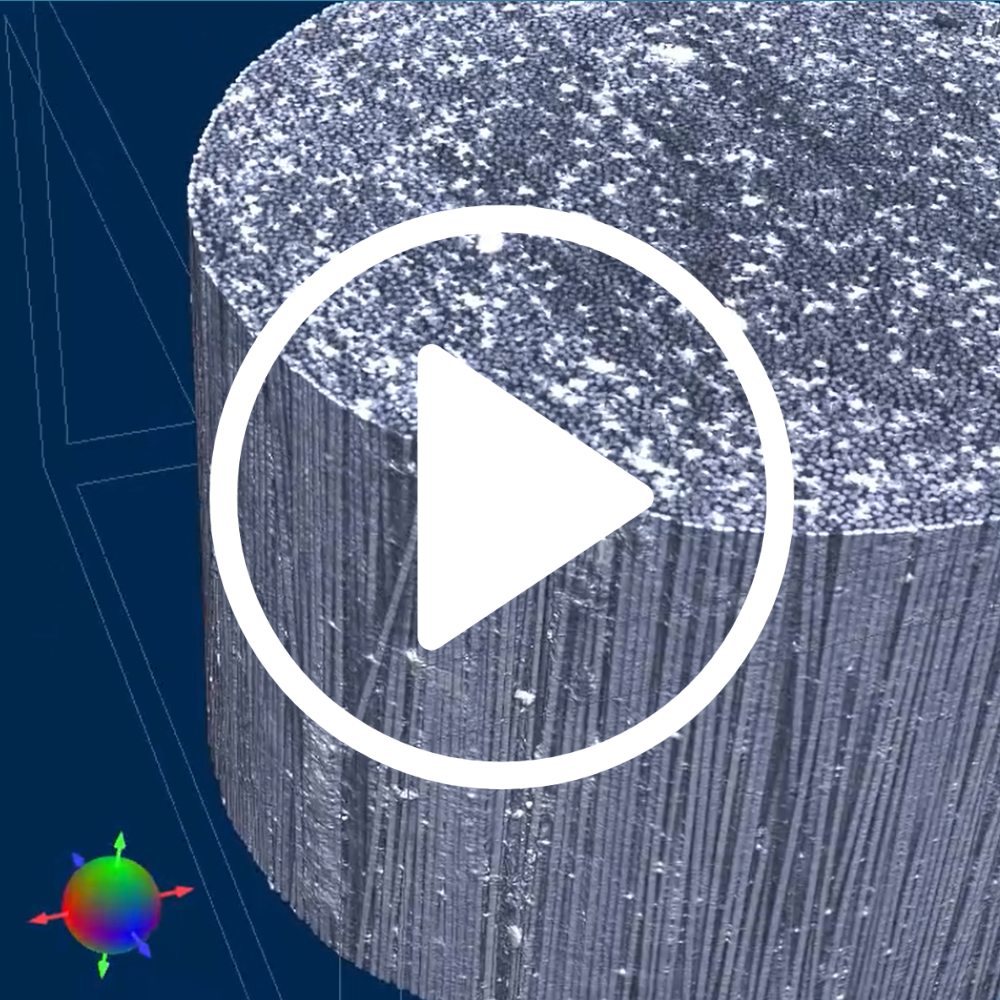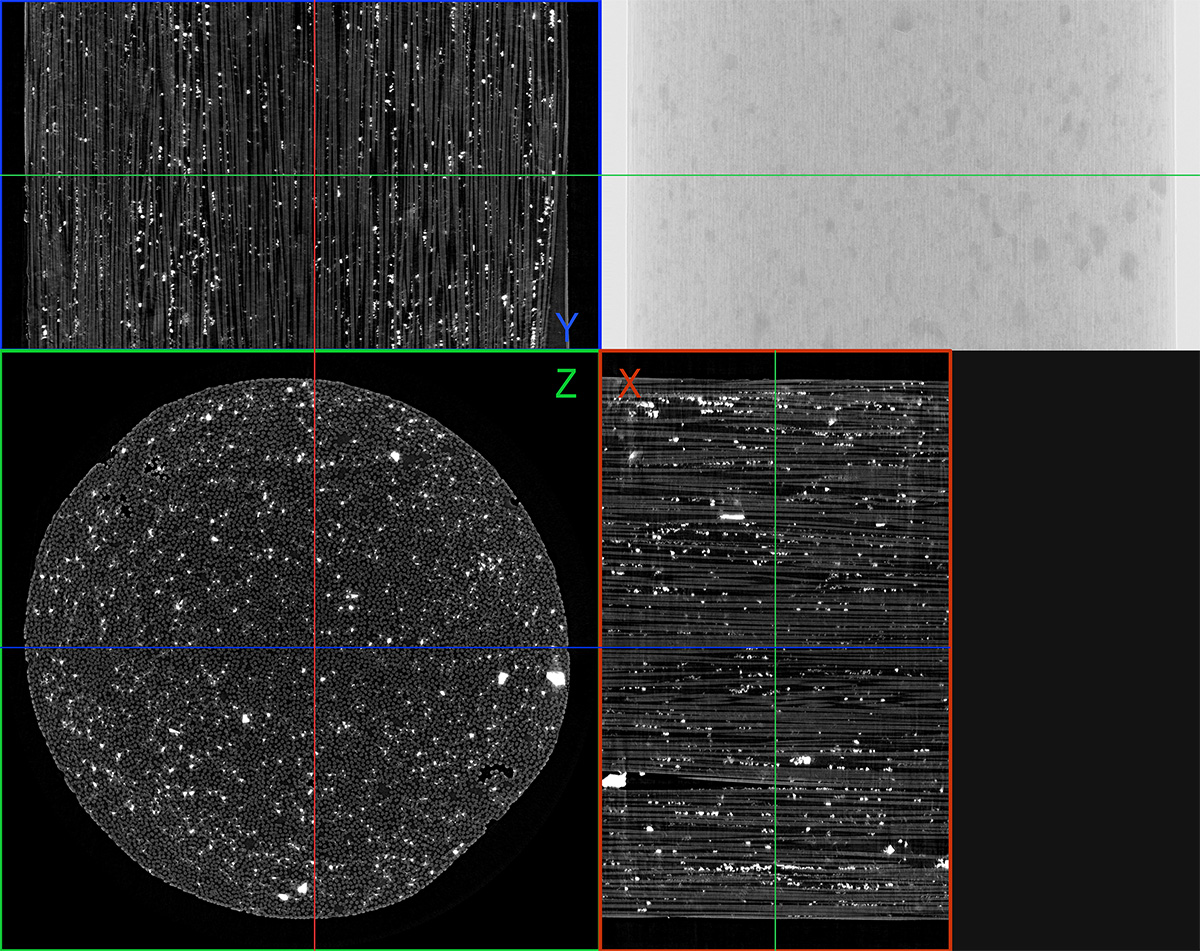 3D vnitřní struktura komerčně dostupného typu polymeru vyztuženého uhlíkovými vlákny (CFRP). Kromě velkého množství vysoce hustých částic v objemu, které negativně ovlivňují pevnost materiálu, poskytuje nano-CT sken při velikosti voxelu 168 nm vynikající zobrazení jednotlivých vláken, pojivového materiálu, pórů a vzduchových inkluzí.