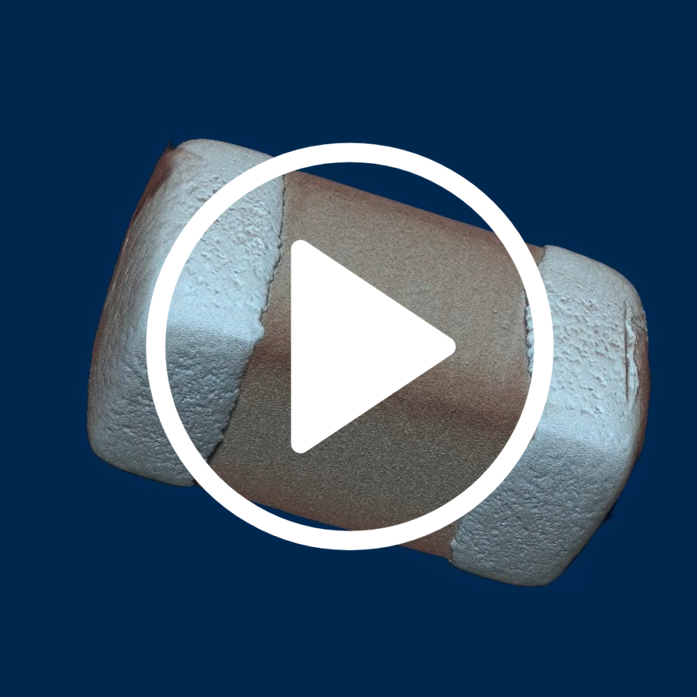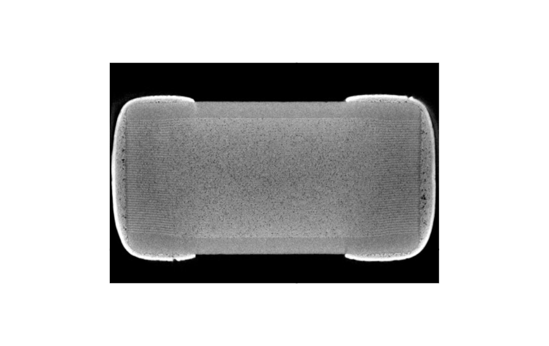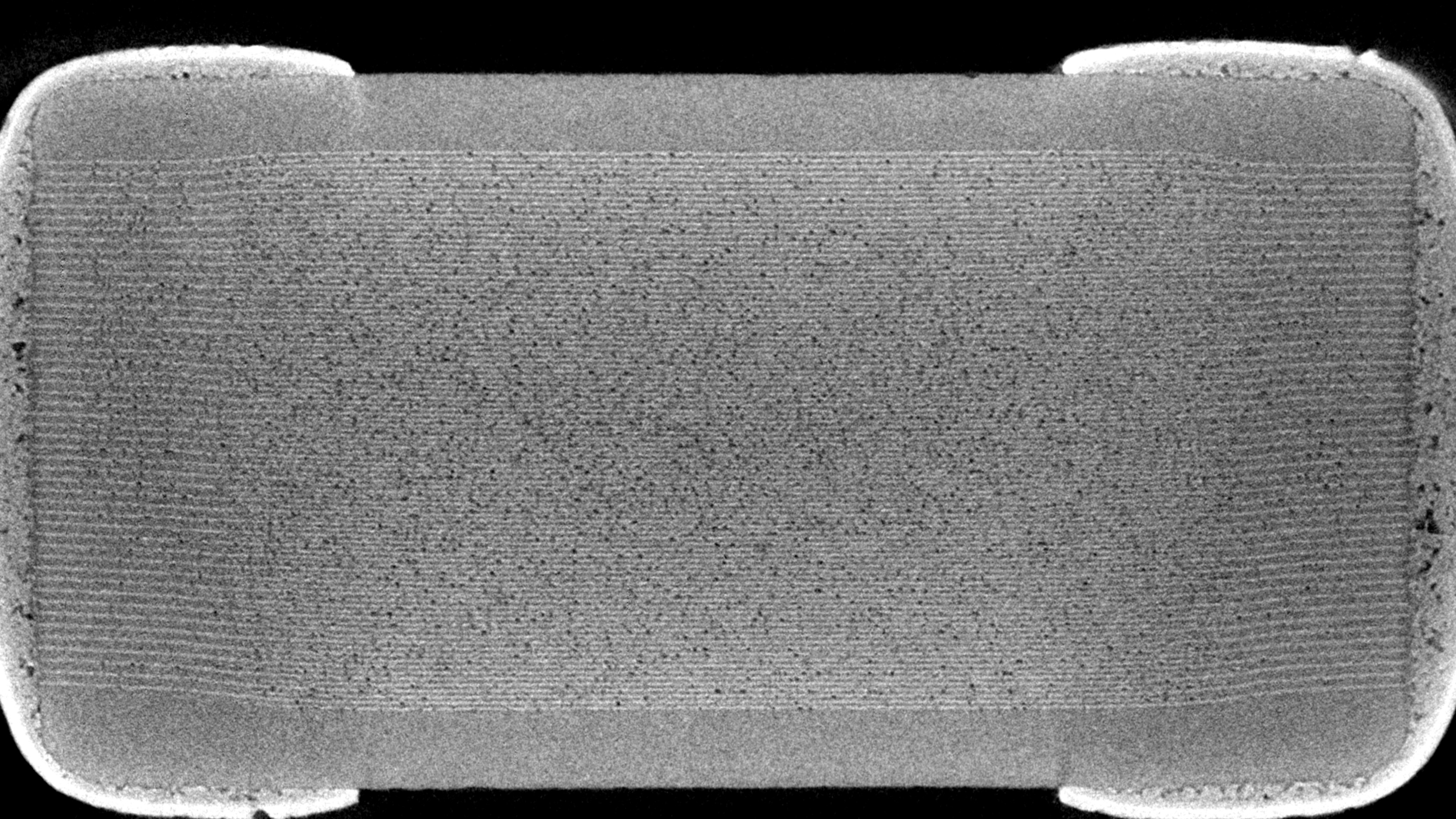 Vícevrstvý keramický kondenzátor skenovaný v nano-CT N90 při velikosti voxelu 170 nm, jasně zobrazující vrstvy elektrodového materiálu o tloušťce v mikrometrech, oddělené keramickým materiálem.
