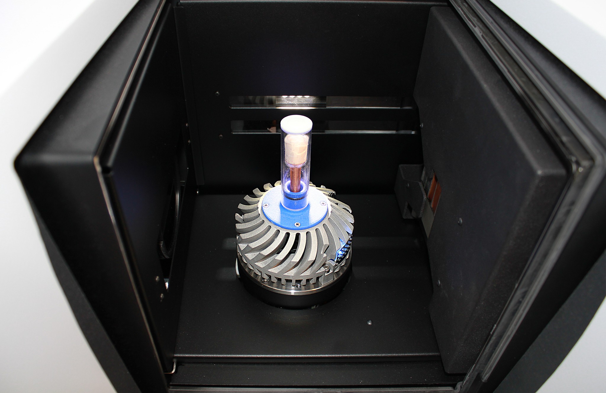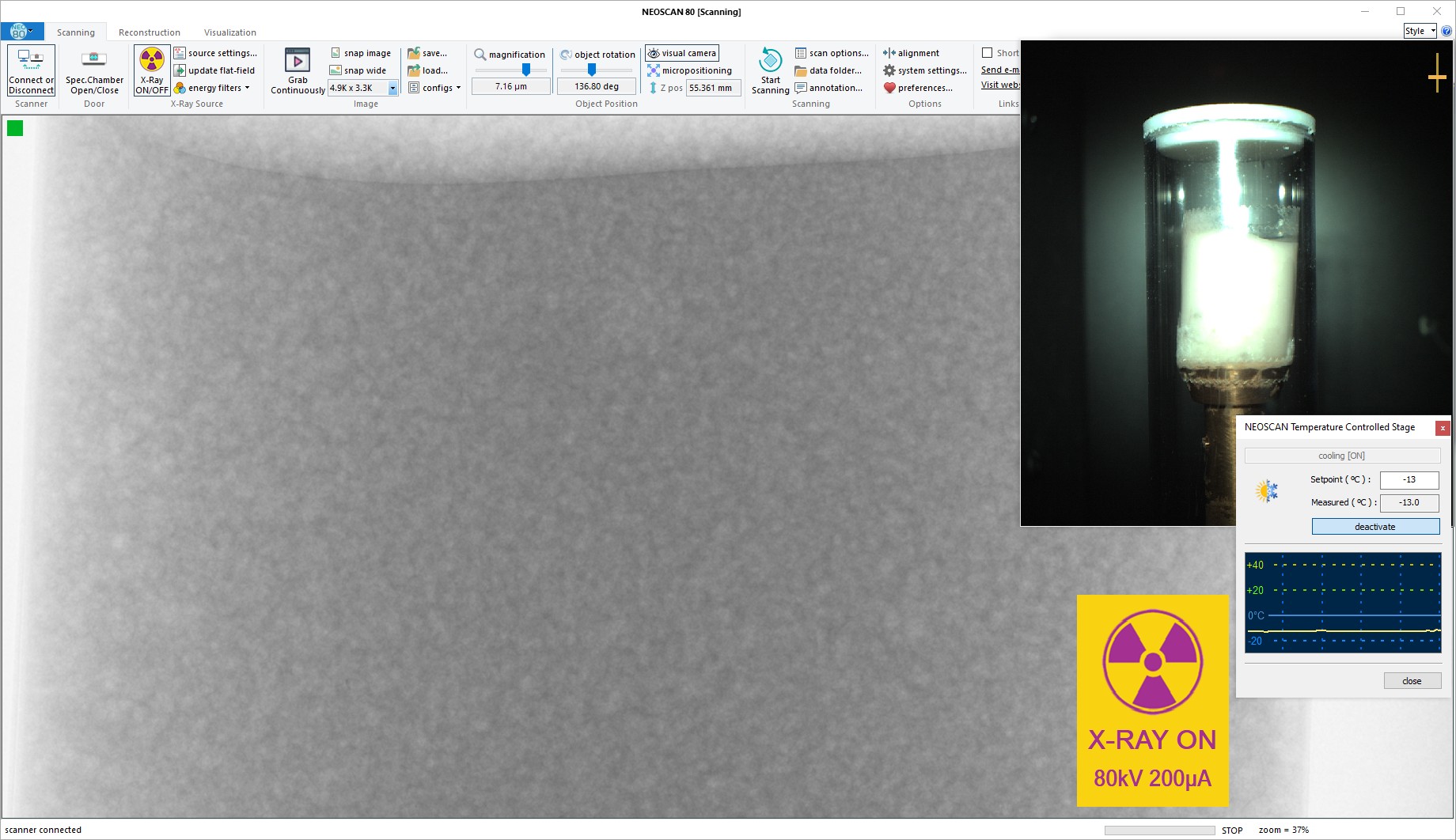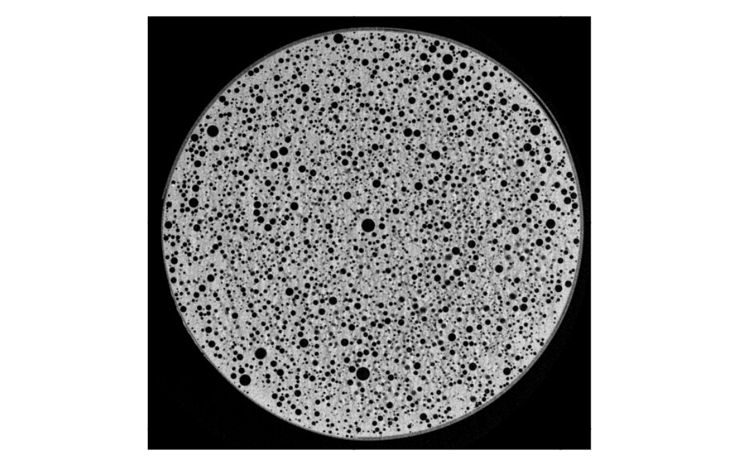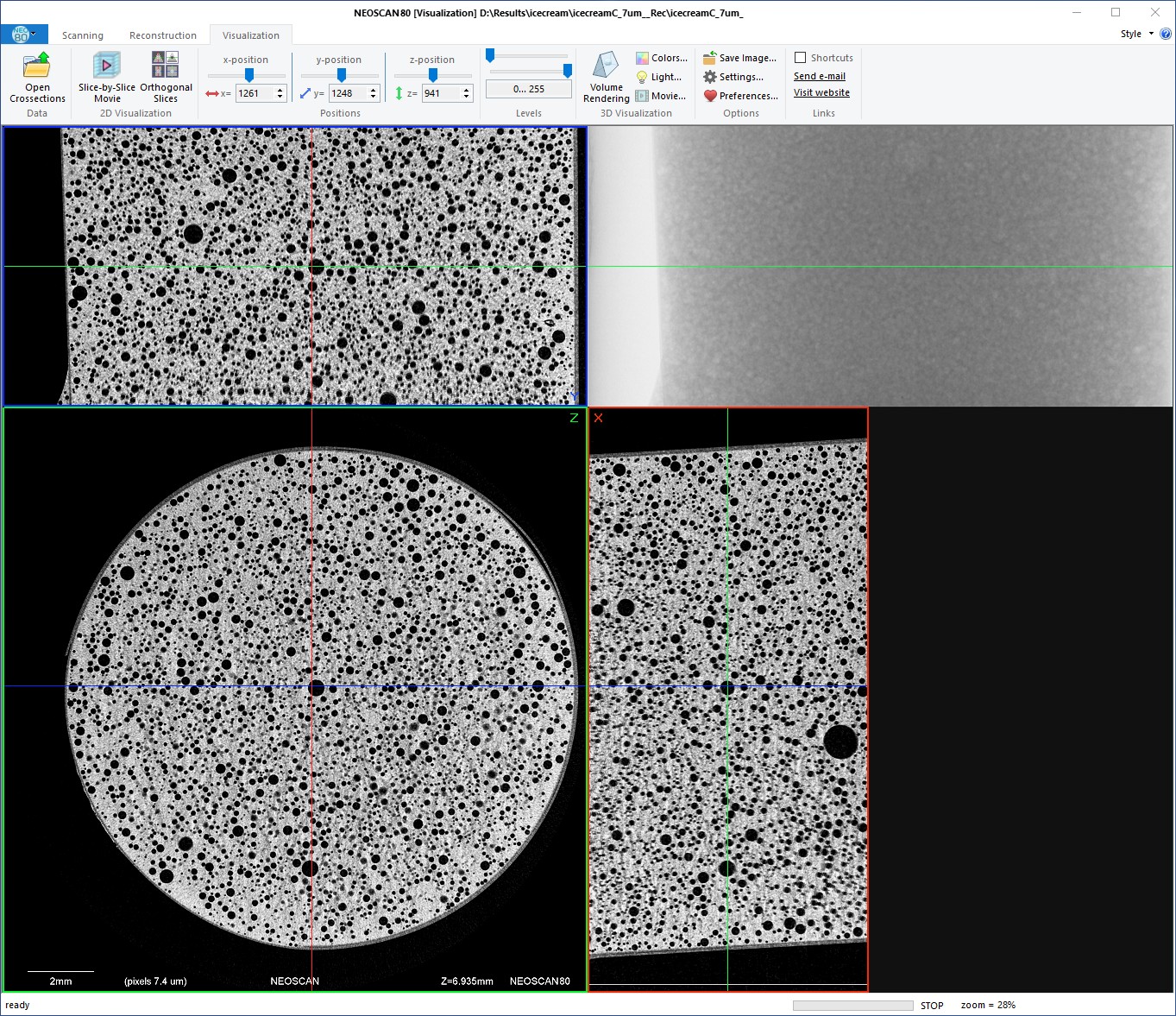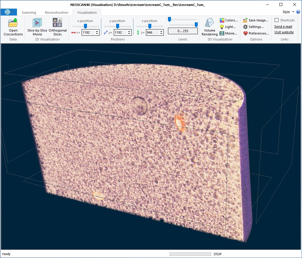Mikro-CT struktura jahodové zmrzliny v přístroji NeoScan N80 při velikosti pixelu 7 µm. Termální modul NeoScan udržuje objem 3 cm³ zmrzliny dostatečně stabilní při −13 °C pro skenování ve vysokém rozlišení.